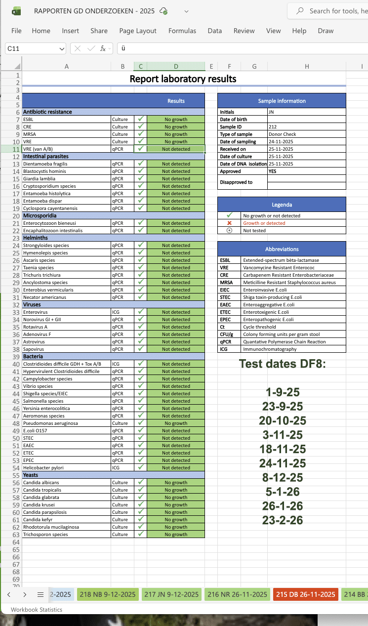 DF6 (Germany) is a former high-level judoka. Never been ill. Anthroposophically raised. Never used medication and eats only from her own kitchen, meat or fish twice a week. Never eats added sugar products. DF6 is a mix of 2 cultures, England and India. Not vaccinated for Covid. Click here for the microbiome report / Click here for fecal test results. / Click here for the blood test DF6 has traveled extensively. In December 2025, she stayed in the Netherlands for two weeks. During this stay, she was retested and fully approved. The enemas are light brown in color and have been tested by a volunteer. With good results. The available period has been used exclusively for the production of enemas. As a result, stock is currently limited. For the microbiome report: click here. For the blood report: click here. For the fecal tests: click here.
